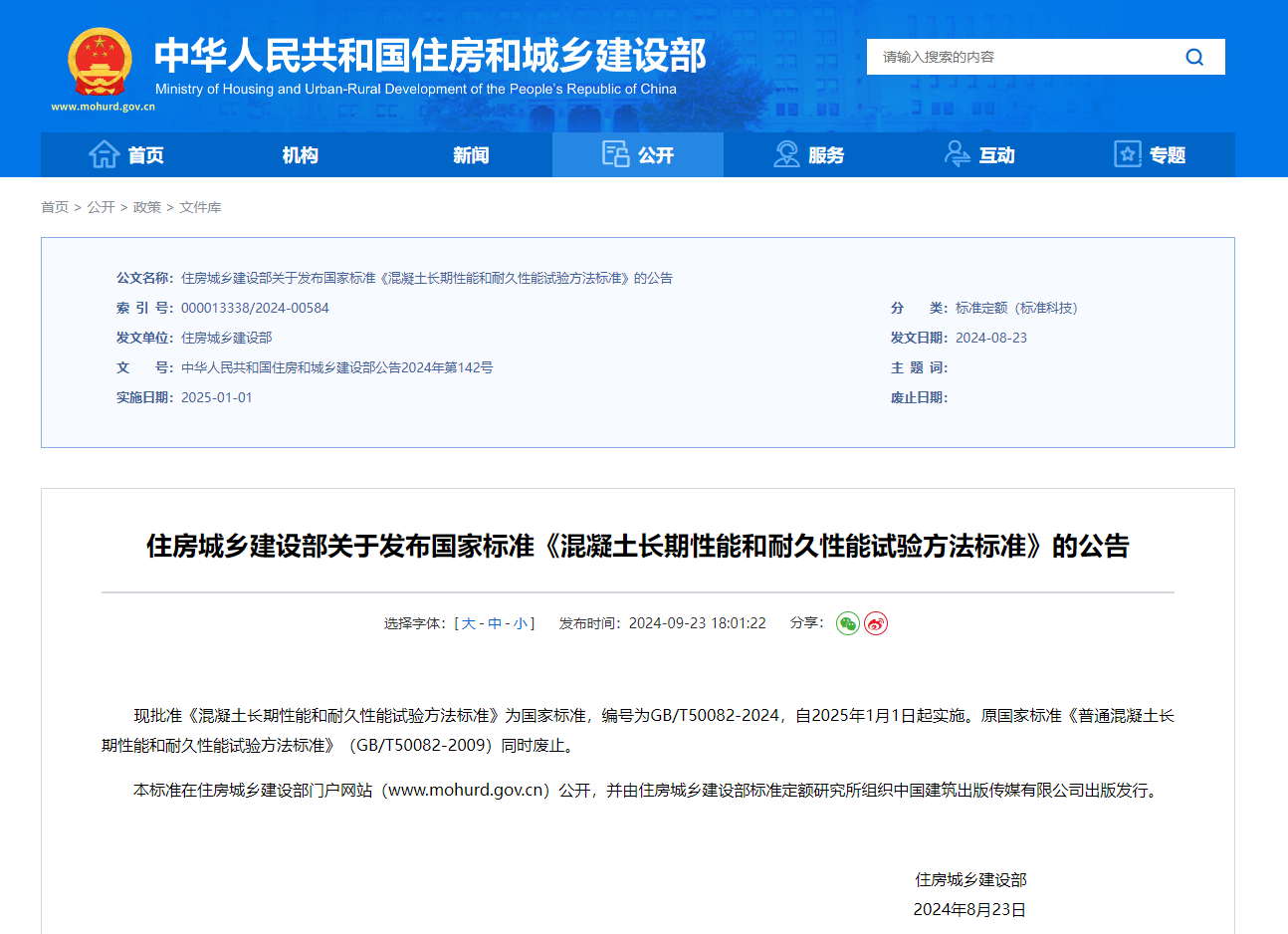 9月23日,住房和城鄉建設部官網發布國家標準《混凝土長期性能和耐久性能試驗方法標準》GB/T50082-2024自2025年1月1日起實施。原國家標準《普通混凝土長期性能和耐久性能試驗方法標準》(GB/T50082-2009)同時廢止。