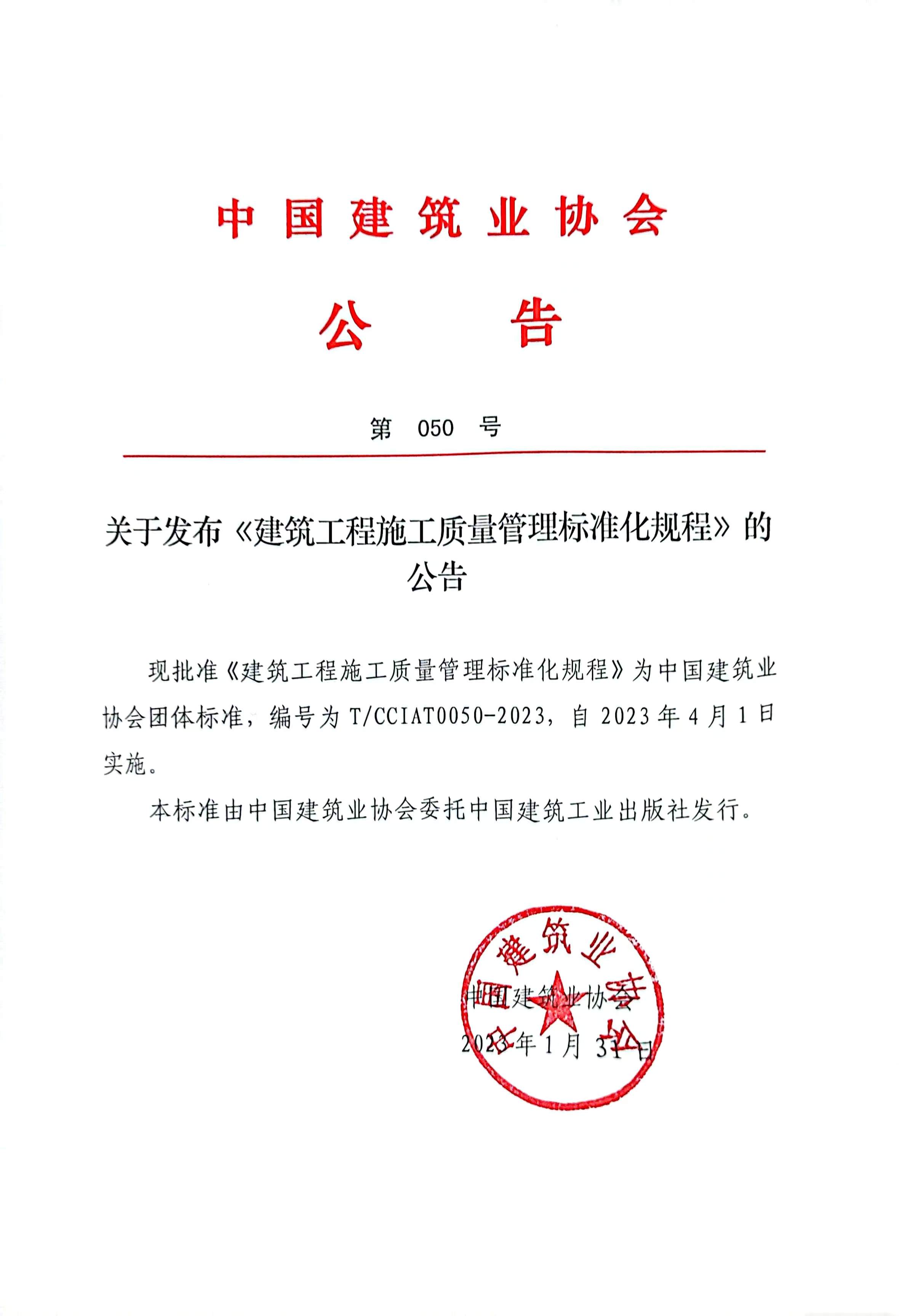 關于發布《建筑工程施工質量管理標準化規程》的公告