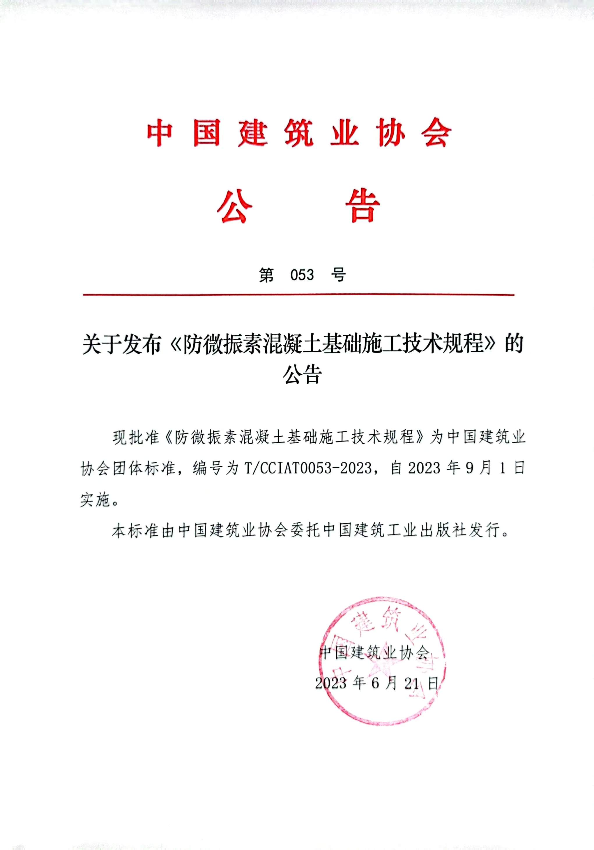 關于發布《防微振素混凝土基礎施工技術規程》的公告