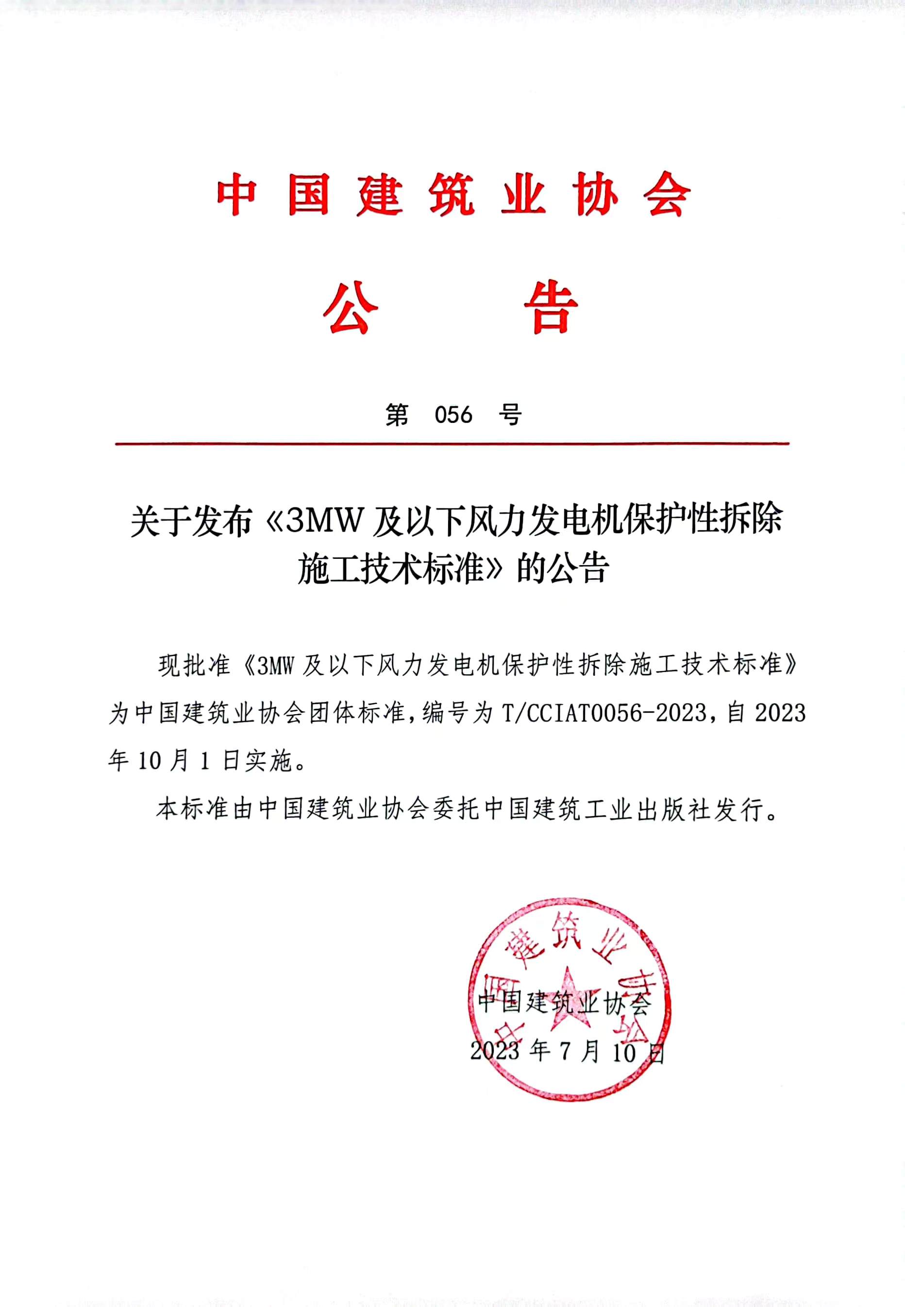 關(guān)于發(fā)布《3MW及以下風力發(fā)電機保護性拆除施工技術(shù)標準》的公告