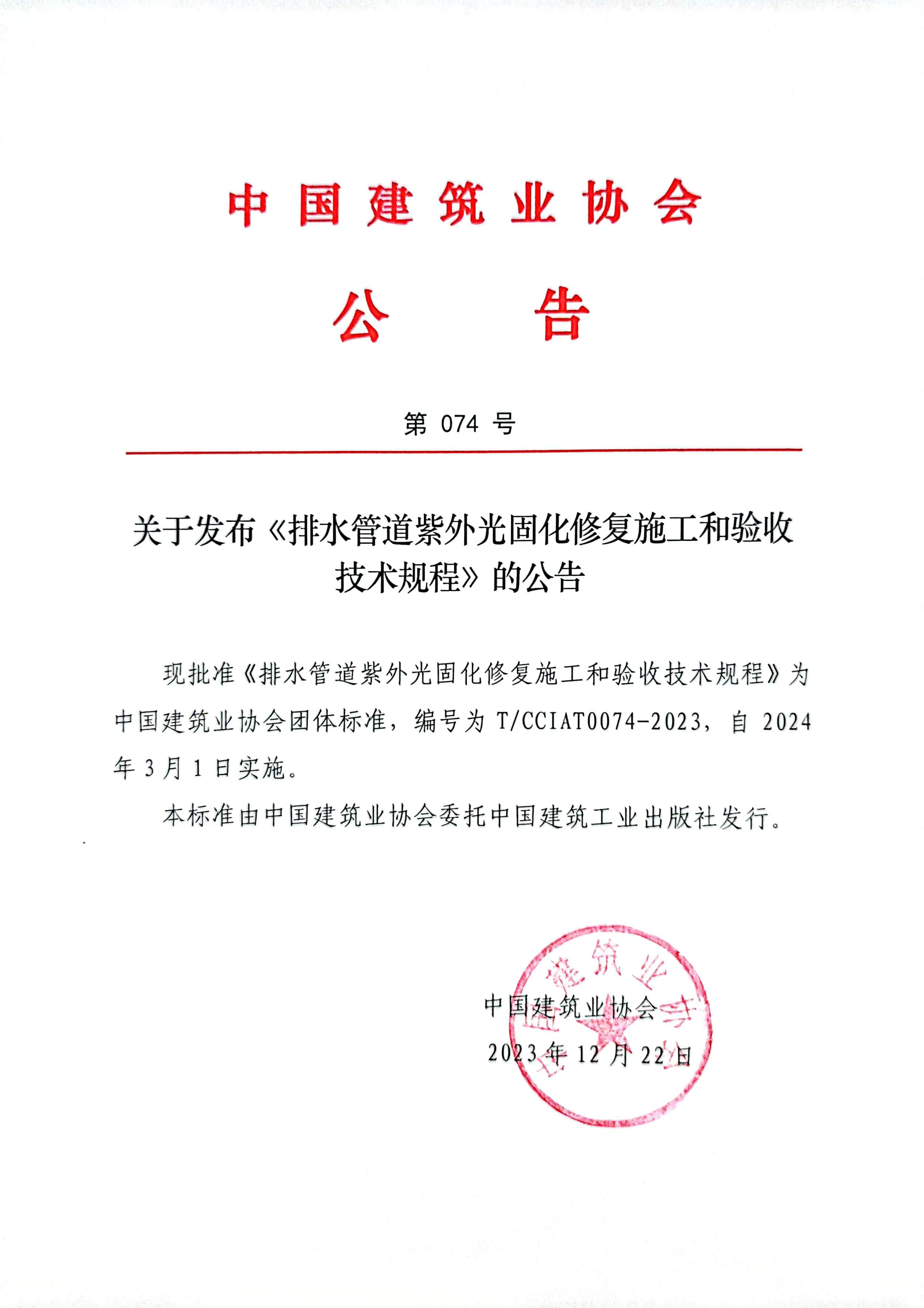 關于發布《排水管道紫外光固化修復施工和驗收技術規程》的公告