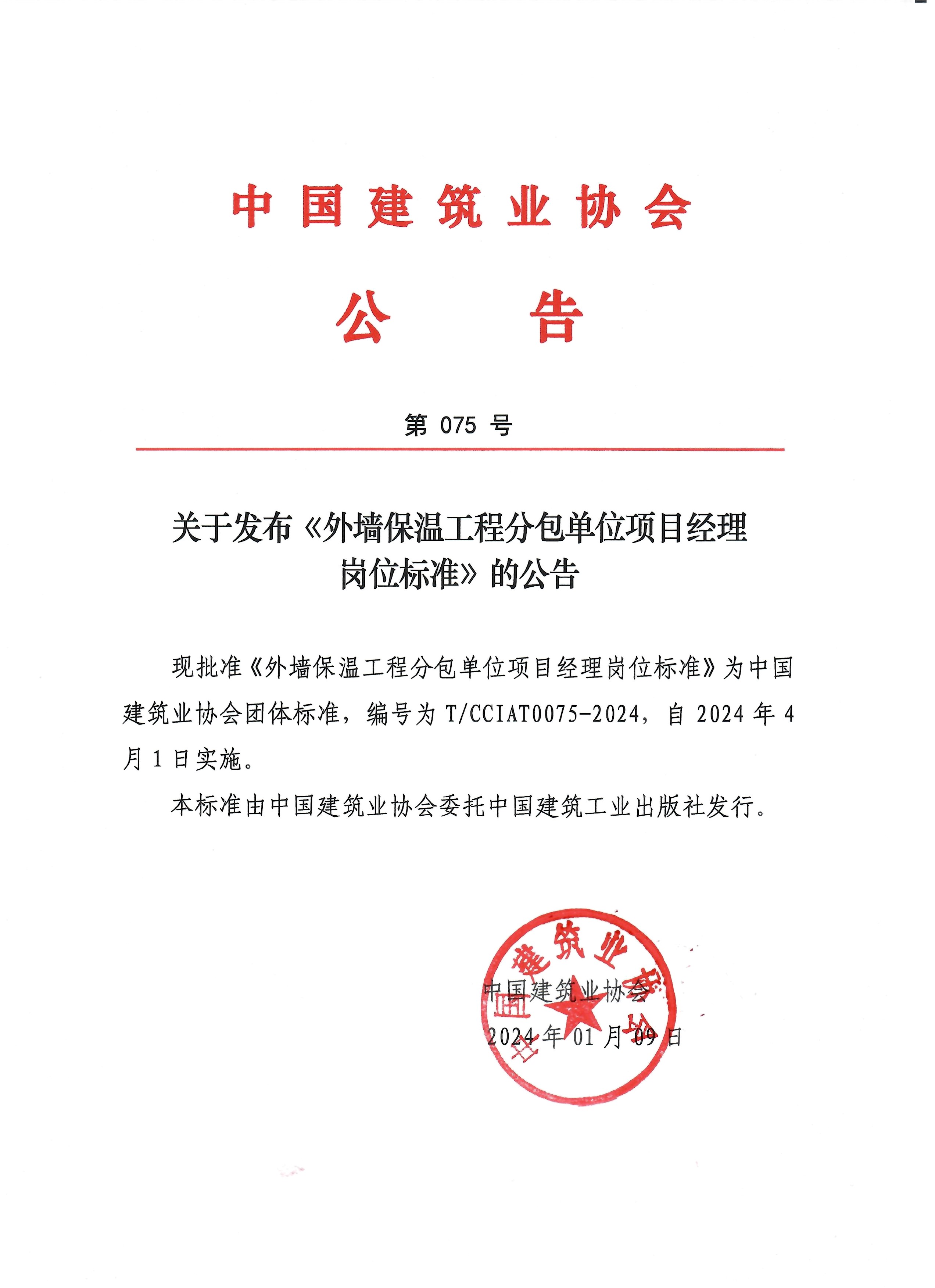 關于發布《外墻保溫工程分包單位項目經理崗位標準》的公告