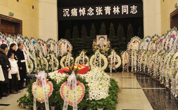 26日上午,八寶山殯儀館東禮堂莊嚴肅穆,哀樂低回,禮堂上方懸掛的黑色白底的橫幅,上面寫著“沉痛悼念張青林同志”,橫幅下方是張青林同志的遺像,張青林同志的遺體安臥在鮮花翠柏叢中,身上覆蓋著鮮紅的中國共產(chǎn)黨黨旗。