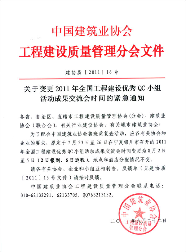 關于變更2011年全國工程建設優秀QC小組活動成果交流會時間的緊急通知
