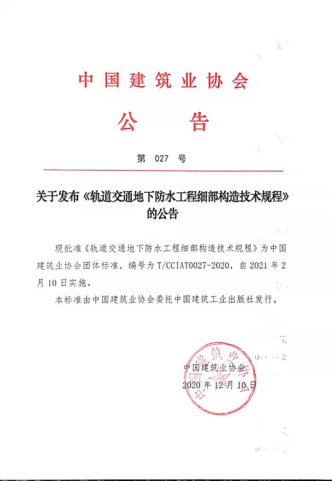 關于發布《軌道交通地下防水工程細部構造技術規程》的公告