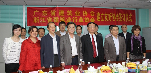 11月10日,浙江省建筑業行業協會趙如龍會長、姚光恒副會長兼秘書長等一行四人到達廣州,與廣東省建筑業協會舉行建立友好協會的簽訂儀式,廣東省建筑業協會李福偉會長、梁劍明秘書長等出席簽訂儀式,兩省協會的現任副會長單位中天建設集團有限公司的駐廣東負責人應邀參加了會議。雙方對協會機構設置、協會工作、兩省建筑業發展情況和前景趨勢等方面進行了交流。李福偉會長和趙如龍會長分別代表廣東省和浙江省建協在友好協會協議上簽字,雙方互贈紀念品并合影留念。