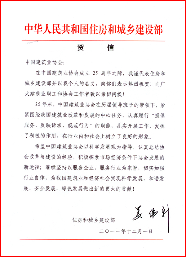 會上,陳重宣讀了住房和城鄉(xiāng)建設(shè)部部長姜偉新的賀信。賀信說,在中國建筑業(yè)協(xié)會成立25周年之際,我謹代表住房和城鄉(xiāng)建設(shè)部并以個人的名義,向你們表示熱烈祝賀!向廣大建筑業(yè)職工和協(xié)會工作者致以親切問候!25年來,中國建筑業(yè)協(xié)會在歷屆領(lǐng)導(dǎo)班子的帶領(lǐng)下,緊緊圍繞我國建筑業(yè)改革和發(fā)展的中心任務(wù),認真履行“提供服務(wù)、反映訴求,規(guī)范行為”的職能,扎實開展工作,發(fā)揮了積極的作用,在行業(yè)內(nèi)和社會上樹立了良好的形象。
