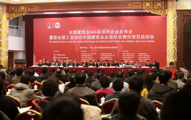 2月21日,由中國建筑業協會舉辦的建筑業AAA級信用企業發布會暨聯合國工業發展組織中國建筑業企業社會責任項目啟動會在北京召開。會議向北京城建集團有限責任公司等93家企業頒發了2013年度建筑業AAA級信用企業證書,并啟動了由中國建筑業協會、聯合國工業發展組織、商務部中國國際經濟技術交流中心合作開展的中國建筑業企業社會責任項目。中國建筑業協會會長鄭一軍、住房城鄉建設部建筑市場監管司司長吳慧娟等出席會議并講話。各地區建筑業協會、有關行業建設協會、有關建筑業企業的代表及國內外知名專家等共300余人參會。會議由中國建筑業協會副會長徐義屏主持。