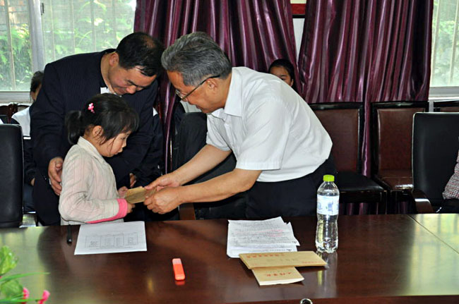 這次捐資助學活動在榮山鎮中心校進行。5月26日上午,花園村小的同學、家長和老師們,曾在花園村小讀書時得到我協會資助、現在讀初中的同學們,以及榮山鎮中心校領導和老師們集聚一堂,慶祝六一國際兒童節到來,召開捐資助學座談會。周福民同志代表協會領導和全體職工向同學們、老師們和家長們問好,祝同學們“六一國際兒童節”快樂。他結合實際談了自己對于尊師重教、關注留守兒童、資助家庭貧困學童的重要意義,表示協會的爺爺奶奶、叔叔阿姨非常關心同學們的學習和生活情況,希望同學們好好學習,長大后成為建設家鄉、建設祖國的有用人才。周福民同志代表協會向花園村小6名困難同學每人發了1200元助學金,向學校贈送了130本、價值3104元的少年讀物(為花園村小建一個小圖書館)。利州區教育局副局長和榮山鎮中心校校長介紹了學校建設和學生學習情況,對我協會一直關心廣元山區的教育事業,堅持捐資助學表示衷心感謝。學生代表、家長代表和曾在花園村小讀書時得到我協會資助、現在讀初中的同學代表發了言。座談會后,參觀了榮山鎮中心校校舍、同學們的繪畫和手工藝展覽,觀看了同學們的音樂演奏。
