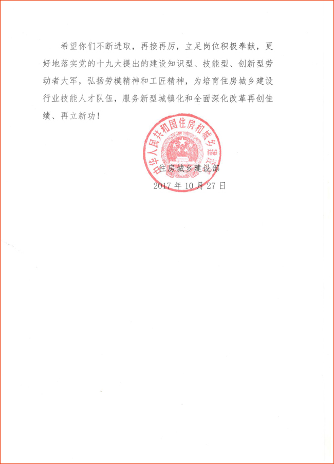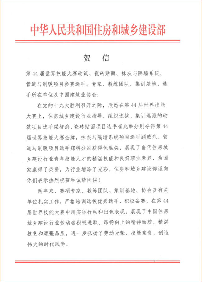 2017年10月19日,第44屆世界技能大賽在阿聯酋阿布扎比閉幕。中國建筑業協會組織選拔集訓的建筑類項目選手成績優異,一舉摘得兩枚金牌,實現了建筑業選手參加世界技能大賽金牌零的突破。住房城鄉建設部向中國建筑業協會及獲獎選手、專家、教練團隊、集訓基地、選手所在單位發來賀信。賀信全文如下: