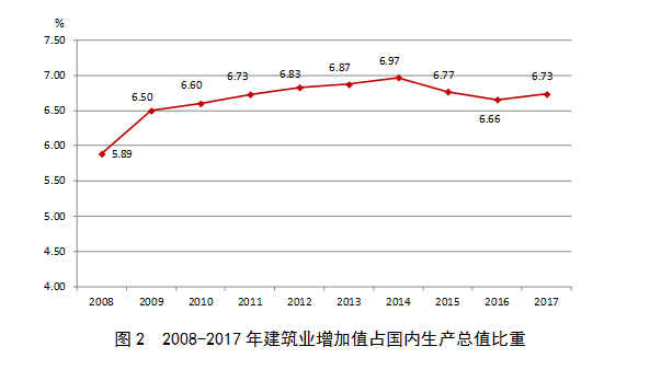 自2009年以來,建筑業(yè)增加值占國內(nèi)生產(chǎn)總值的比例始終保持在6.5%以上。2017年在上年下降的情況下出現(xiàn)回升,達到了6.73%的較高點(圖2),建筑業(yè)國民經(jīng)濟支柱產(chǎn)業(yè)的地位穩(wěn)固。