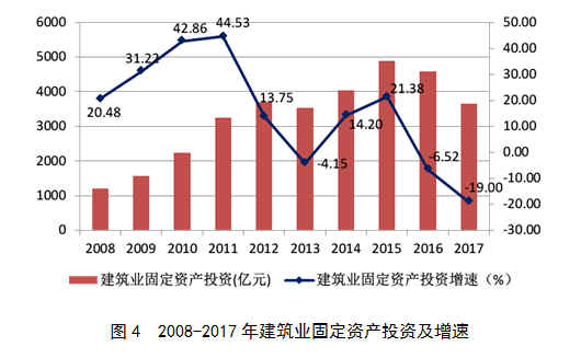 2017年,全社會固定資產(chǎn)投資(不含農(nóng)戶,下同)631684億元,比上年增長7.20%,增速繼續(xù)呈下滑態(tài)勢(圖3)。建筑業(yè)固定資產(chǎn)投資3648億元,比上年降低19.00%(圖4),占全社會固定資產(chǎn)投資的0.58%,比上年減少0.19個百分點。