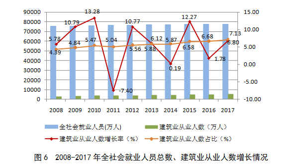 2017年底,全社會就業(yè)人員總數(shù)77640萬人,其中,建筑業(yè)從業(yè)人數(shù)5536.90萬人,比上年末增加352.36萬人,增長6.80%。建筑業(yè)從業(yè)人數(shù)占全社會就業(yè)人員總數(shù)的7.13%,比上年提高0. 45個百分點,占比再創(chuàng)新高(圖6)。建筑業(yè)在吸納農(nóng)村轉(zhuǎn)移人口就業(yè)、推進新型城鎮(zhèn)化建設(shè)和維護社會穩(wěn)定等方面繼續(xù)發(fā)揮顯著作用。