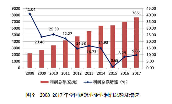 2017年,全國建筑業(yè)企業(yè)實現(xiàn)利潤7661億元,比上年增加674.95億元,增速為9.66%,增速比上年高1.37個百分點(圖9)。