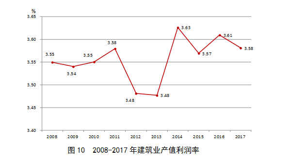 近10年來,建筑業(yè)產(chǎn)值利潤率(利潤總額與總產(chǎn)值之比)一直在3.5%上下徘徊。2017年,建筑業(yè)產(chǎn)值利潤率為3.58 %,比上年降低了0.03個百分點(圖10)。