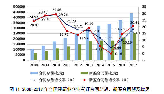 2017年,在以習(xí)近平同志為核心的黨中央堅強領(lǐng)導(dǎo)下,建筑業(yè)深入學(xué)習(xí)貫徹黨的十九大會議精神,認(rèn)真落實《國務(wù)院辦公廳關(guān)于促進建筑業(yè)持續(xù)健康發(fā)展的意見》(國辦發(fā)〔2017〕19號),全面深化改革,加快轉(zhuǎn)型升級,積極推進建筑產(chǎn)業(yè)現(xiàn)代化,整體發(fā)展穩(wěn)中有進,發(fā)展質(zhì)量不斷提升。全國建筑業(yè)企業(yè)(指具有資質(zhì)等級的總承包和專業(yè)承包建筑業(yè)企業(yè),不含勞務(wù)分包建筑業(yè)企業(yè),下同)完成建筑業(yè)總產(chǎn)值213953.96億元,同比增長10.53%;完成竣工產(chǎn)值116791.89億元,同比增長3.46%;簽訂合同總額439524.36 億元,同比增長18.10%,其中新簽合同額254665.71億元,同比增長20.41%;完成房屋施工面積131.72億平方米,同比增長4.19%;完成房屋竣工面積41.91億平方米,同比下降0.78%;實現(xiàn)利潤7661億元,同比增長9.66%。截至2017年底,全國有施工活動的建筑業(yè)企業(yè)88059個,同比增長6.07%;從業(yè)人數(shù)5536.90萬人,同比增長6.80%;按建筑業(yè)總產(chǎn)值計算的勞動生產(chǎn)率為347462元/人,同比增長3.11%。