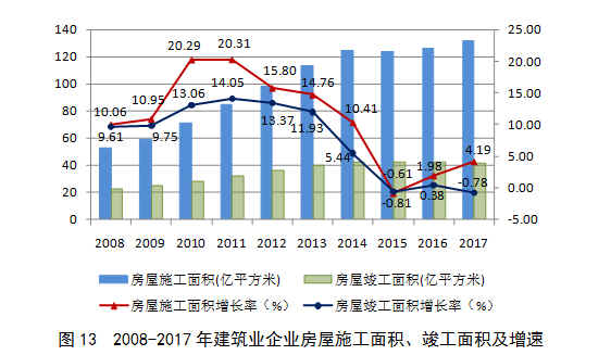 2017年,全國建筑業(yè)企業(yè)房屋施工面積131.72億平方米,比上年增長4.19%,增速連持續(xù)兩年保持增長。竣工面積41.91億平方米,比上年下降0.78%(圖13)。