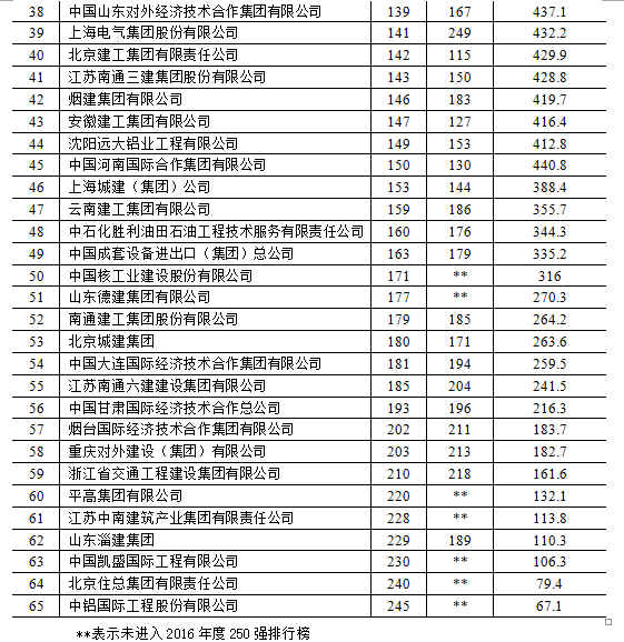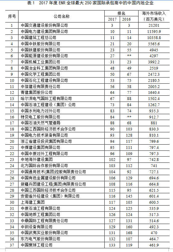 美國《工程新聞記錄》(簡稱“ENR”)雜志公布的2017年度全球最大250家國際承包商共實現(xiàn)營業(yè)收入4681.2億美元,比上一年度下降了6.4%,下滑的態(tài)勢已經(jīng)持續(xù)了三年,且降幅有了明顯的擴大。我國內(nèi)地共有65家企業(yè)入選2017年度全球最大250家國際承包商榜單,入選數(shù)量與上年持平。入選企業(yè)共實現(xiàn)海外市場營業(yè)收入987.2億美元,比上年增長了5.4%,占250家國際承包商場營業(yè)收入總額的21.1 %,比上年提高1.8個百分點。