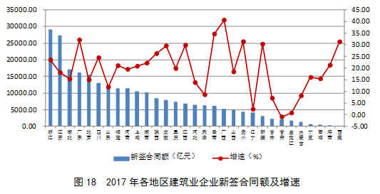 2017年,全國建筑業(yè)企業(yè)新簽合同額254665.71億元,比上年增長20.41%,增速較上年提高了4.99個百分點。浙江、江蘇兩省建筑業(yè)企業(yè)新簽合同額繼續(xù)占據(jù)前兩位,分別達到29036.41億元、27302.47億元,占各自簽訂合同額總量的64.20%、60.83%,且出現(xiàn)較大幅度的增長,分別比上年增長了23.47%和18.07%。新簽合同額超過8000億元的還有湖北、廣東、北京、四川、山東、福建、河南、上海、湖南、陜西等10個地區(qū)。新簽合同額增速超過25%的有廣西、云南、廣東、貴州、西藏、新疆、江西、安徽、陜西等9個地區(qū),分別增長40.56%、34.61%、32.07%、31.32%、31.24%、30.25%、29.77%、29.52%、26.19%。甘肅出現(xiàn)了-0.93%的負(fù)增長(圖18)。