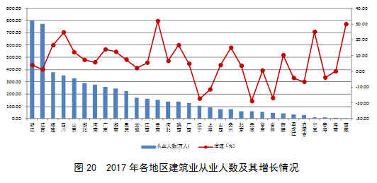 圖20 2017年各地區(qū)建筑業(yè)從業(yè)人數(shù)及其增長情況
