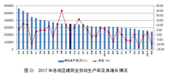 2017年,按建筑業(yè)總產(chǎn)值計算的勞動生產(chǎn)率排序前三位的地區(qū)是北京、上海和湖北。北京自2012年來連續(xù)6年領(lǐng)跑全國,2017年勞動生產(chǎn)率為564242元/人,比上年增長5.69%;上海2017年勞動生產(chǎn)率為532485元/人,比上年增長了11.40%;湖北2017年勞動生產(chǎn)率為506235元/人,比上年增長了10.34%。20個地區(qū)按建筑業(yè)總產(chǎn)值計算的勞動生產(chǎn)率有所提高,11個地區(qū)有所降低。增速超過10%的有吉林、山西、上海、貴州、湖北和遼寧6個地區(qū)(圖21)。