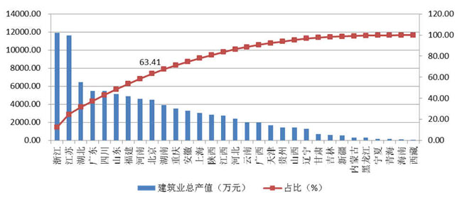 除浙江、江蘇兩省外,總產(chǎn)值超過4000億元的還有湖北、廣東、四川、山東、福建、河南和北京共7個地區(qū),上述9省市完成的建筑業(yè)總產(chǎn)值占全國建筑業(yè)總產(chǎn)值的63.41%(圖1)。