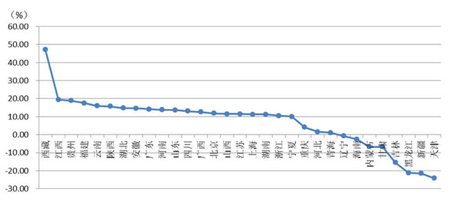 從各地區(qū)建筑業(yè)總產(chǎn)值增長情況看,有23個地區(qū)的建筑業(yè)總產(chǎn)值較上年同期有不同幅度的增長。其中,西藏、江西、貴州、福建、云南、陜西的增幅均超過15%。有8個地區(qū)出現(xiàn)負增長,其中,天津、新疆、黑龍江、吉林出現(xiàn)了15%以上的負增長(圖2)。