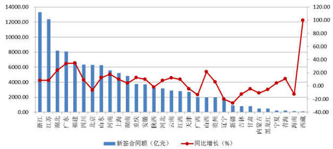 圖3 2018年上半年各地區(qū)建筑業(yè)企業(yè)新簽合同額及增速