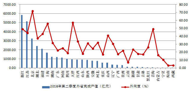 圖4 2018年上半年各地區(qū)跨省完成的建筑業(yè)總產(chǎn)值及外向度