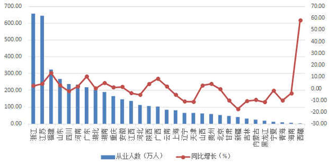 圖5 2018年上半年各地區(qū)建筑業(yè)從業(yè)人數(shù)及增速
