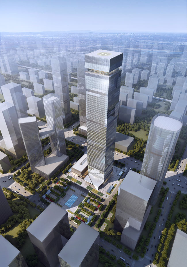 據悉:國瑞•西安金融中心項目位于西安市高新區創業新大陸北側,由一棟高達350米的超高塔樓(75層)、24米高裙房(3層)和4層整體地下室組成,總建筑面積約29萬平方米,集辦公、商業、餐飲及高級會所等功能,建成后將成為西安第一高樓。在結構形式上,塔樓主基礎采用大直徑灌注樁加筏板形式,其余基礎采用抗拔樁加筏板形式。其中,塔樓主體采用框架核心筒混合結構,底板至11層鋼筋混凝土核心筒剪力墻內設置單鋼板墻,11層以上墻體內置鋼骨柱;塔樓外框架柱均為鋼骨柱,地下室為16根雙十字柱截面鋼柱,通過首層轉換為32根十字型鋼骨柱。35層以上變化為H型截面。外框樓層結構采用鋼梁與鋼筋桁架組合樓板形式。整個塔樓豎向設3道一層高加強桁架層(24、51、64層),由腰桁架及伸臂桁架組成。塔樓屋頂為鋼結構觀景平臺。裙房采用框架剪力墻結構,頂層為鋼框架結構。塔樓與裙樓之間設有一座鋼連橋。