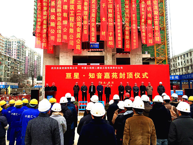 近日,武漢亙星•知音嘉苑項目在漢陽舉行簡樸的主體結構封頂儀式,武漢工業控股集團有限公司董事長、黨委書記王法圣、中建三局二公司副總經理黃安平,及設計院、監理公司、雙方管理人員等110余人參加。
