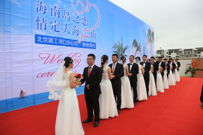 說(shuō)起舉辦這次集體婚禮的初衷,北京建工四建海南分公司經(jīng)理劉磊介紹“四建公司自2009年進(jìn)入海南市場(chǎng),從一個(gè)項(xiàng)目部,30多名員工,一步步發(fā)展到今天,8個(gè)整建制項(xiàng)目部,307名員工,18項(xiàng)在施工程,總建筑面積超260萬(wàn)平方米。其中青年職工201人,占到職工總數(shù)的67%,尤其是2009-2010年進(jìn)入海南時(shí)期的青年員工,現(xiàn)如今均已到成家立業(yè)的年齡,他們是北京建工在海南發(fā)展的排頭兵,他們將自己6年的青春貢獻(xiàn)給了海口國(guó)興大道兩側(cè)的建筑物,留下了‘國(guó)興大道建工街’的美名。分公司領(lǐng)導(dǎo)班子感念青年人的無(wú)悔付出,集體決定為他們組織一場(chǎng)難忘的集體婚禮,以增加青年職工的企業(yè)歸屬感,建立員工‘愛(ài)家就是愛(ài)企業(yè),愛(ài)企業(yè)就是愛(ài)家’的企業(yè)認(rèn)同感。”
