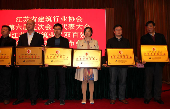 3月30日—31日,由江蘇省建筑行業協會組織召開的江蘇省建筑行業協會第六屆五次會員代表大會暨2015年度江蘇省建筑業“雙百強”企業評價排名發布會在南京雙門樓賓館召開。江蘇中南建筑產業集團有限責任公司作為副會長單位受邀參會,公司執行董事陶燕出席會議。本次活動期間,江蘇中南建筑產業集團有限責任公司榮獲了2015年度江蘇省建筑業競爭力百強企業榮譽稱號,并且排名名列前茅。