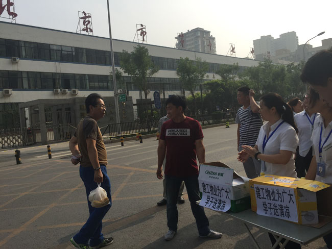 每年的6月7日、8日是全國高考的日子,社會各界都在默默地為高考做著貢獻,為高考保駕護航。為助力高考,北京建工物業(yè)百子灣家園的工作人員帶著國企的深情厚誼來到了北京市第十七中學的門口為守候在學校門口的警察同志、學生家長、服務人員送來了冰紅茶、礦泉水、小凳等物品,供學生家長解暑、休息,學生家長和警察同志翹手稱贊表示感謝!