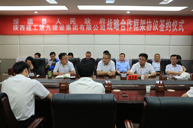 5月25日夜間,陜建九建集團與綏德縣攜手在政府會議室舉行了戰略合作協議簽約儀式。綏德縣縣長姬躍飛出席主持,并與九建集團董事長賀國健分別代表雙方簽約。綏德縣副縣長張永彬、政協副主席趙青、物流園區管委會主任劉漢君、縣政府黨組成員薛士會及集團總經理牛新會等領導出席簽約儀式。