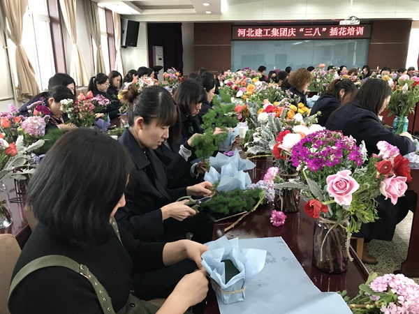 3月8日上午,河北建工集團六樓會議室,70多名女職工置身鮮花叢中,用心學習鮮花養(yǎng)護知識、花語以及插花技巧。