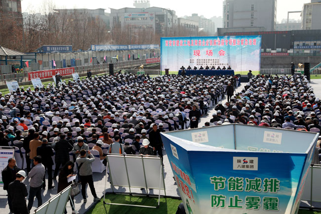 章輝在發言中指出,長期以來陜建八建集團秉承“智圓行方、厚德載物”的企業哲學,以“傳承魯班精神,共享美好生活”為使命,依托質量、安全、科技、綠色、文明施工“五位一體”的精品生產線管理模式,為保持鐵腕治霾專項整治常態治理,從五個方面為抓手,認真做好工作。一是統一思想,持續提高治污減霾工作主動性、自覺性。通過專項會議、專題培訓、企業內刊、辦公平臺、QQ群、微信公眾號等多種方式,持續宣傳教育,統一思想,達成共識,使治污減霾工作成為常態化。二是明確目標,分解責任,形成標準化管理體系。編制《治污減霾專項方案》,將任務層層分解,簽訂目標責任書,做到責任到人。將治污減霾納入項目績效考核。三是加強專項治理,確保各項措施落實到位。根據《西安市2018年“鐵腕治霾、保衛藍天”施工揚塵防治專項行動方案》和《西安市建設工地施工揚塵治理“六個百分之百”指導圖例》,針對本次會議明確的十二項重點整治問題,組織開展專項治理,確保各項措施落實到位。四是繼續完善制度,確保常態化管理。充分發揮集團治污減霾專項工作領導小組作用,進一步細化對治污減霾、揚塵防治工作前期策劃、過程控制、成效評價等全部管理環節的標準和要求。五是以人為本,重視科技創新。依托省級企業技術中心、BIM技術中心、試驗室,與知名高校的合作關系,發揮1+N開放式技術保障平臺作用,加強技術攻關和工藝創新。通過大力推廣應用先進技術手段,確保安全生產的同時,不斷提高治污減霾、揚塵防治效果,有效減少施工過程對環境的影響。