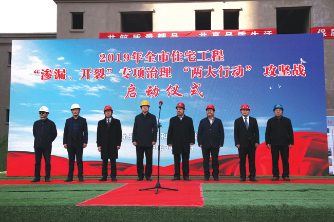 現(xiàn)場會上,青島市住房城鄉(xiāng)建設(shè)局黨組書記、局長陳勇宣布2019年全市住宅工程“滲漏、開裂”專項治理“兩大行動”攻堅戰(zhàn)啟動,并向全行業(yè)發(fā)出號召,堅持以人民為中心的發(fā)展思想,下大功夫解決群眾居住生活“痛點”,聚焦住宅“滲漏、開裂”兩大質(zhì)量問題,以攻山頭、炸碉堡的勇氣和決心,采取切實有效的措施,大幅度減少新建住宅兩大“頑疾”隱患,切實把質(zhì)量投訴數(shù)量降下來,讓更多的島城市民享受到高品質(zhì)住房帶來的幸福感和獲得感。