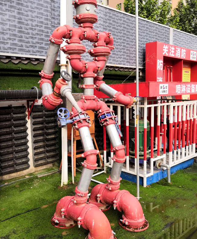 叫它“消防機器人”,其實并不是用來滅火的,只是組成它身體的每一個部件,都是工地上常用的消防和自來水管件。一旦PM值(空氣中所含顆粒物)臨界,它就會啟動報警并自動噴淋降塵。