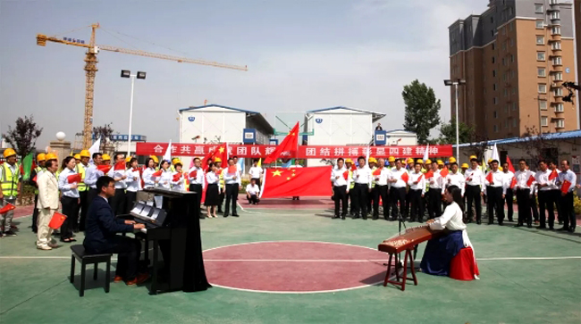 活動現場,數名青年干部職工身著四建工裝,佩戴黨徽,手上揮舞著小國旗,深情唱著這首祖國贊歌,正在項目工地的農民工也放下手上工作,紛紛加入“快閃”隊員們的合唱中來,不少青年干部職工拿起手機進行拍攝,記錄下這激動人心時刻,并發布到朋友圈。恰逢長安銀行渭南分行黨委書記、行長張百寧一行到集團公司學習交流,在看到四建集團青年干部職工用自己行動詮釋愛國情感,與四建集團公司黨委書記、董事長、總經理陳康健及其他領導班子成員一起加入到快閃活動中。