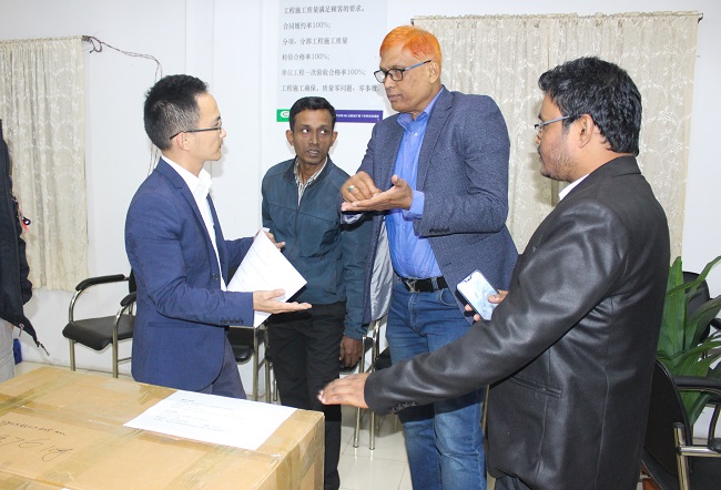孟加拉N8改擴建項目7標負責人張奎正與順豐孟加拉辦事處人員咨詢貨物運送細節。馬洪強 攝