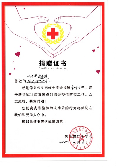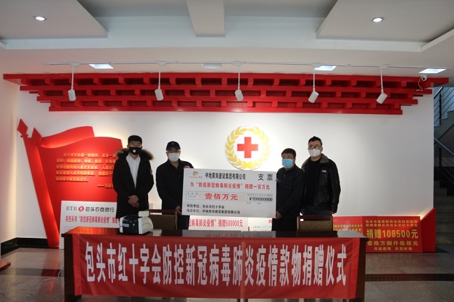在做好集團員工自身防疫措施的同時,疫情面前集團公司勇于承擔社會責任。2月6日上午,中地寅崗建設集團有限公司啟動疫情防控愛心捐款行動,集團公司以董事長(總經(jīng)理)郭志軒、副總經(jīng)理劉峰、綜合部部長王琛熙為代表通過包頭市紅十字會向包頭市第一附屬醫(yī)院及湖北省紅十字會捐款人民幣共計100萬元,用于新冠病毒疫情防控工作。此次捐贈儀式在包頭市紅十字會救災備災中心舉行,紅十字會副會長王云峰及集團公司代表出席本次捐贈儀式。