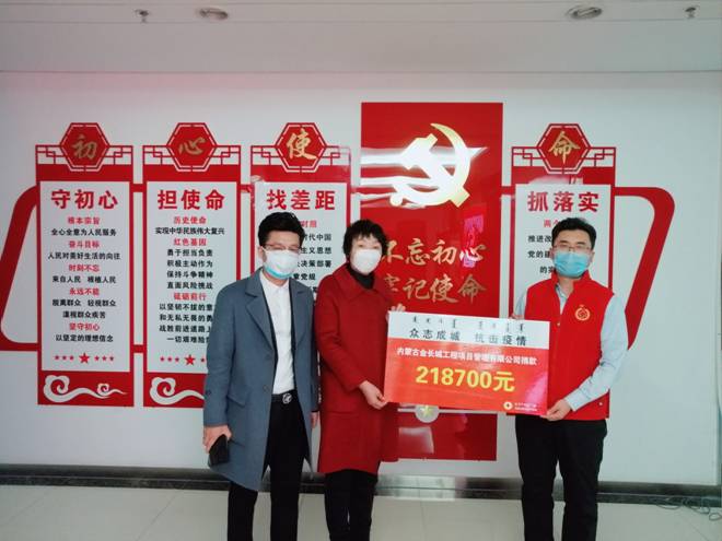 新型冠狀病毒肺炎疫情發展態勢嚴峻,時刻牽動著億萬同胞的心,在疫情防控的關鍵時刻,內蒙古金長城工程項目管理有限公司以強烈的家國情懷和高度的社會責任感,在董事長王麗梅的帶領下,第一時間行動起來,踴躍為抗擊疫情貢獻力量,2020年2月10日內蒙古金長城工程項目管理有限公司通過鄂爾多斯市紅十字會捐款人民幣218700元,其中10萬元用于鄂爾多斯市新型冠狀病毒肺炎疫情防控工作,6.87萬元用于武漢市新型冠狀病毒肺炎疫情防控工作,3萬元用于興安盟新型冠狀病毒肺炎疫情防控工作,2萬元用于阿爾山市新型冠狀病毒肺炎疫情防控工作。