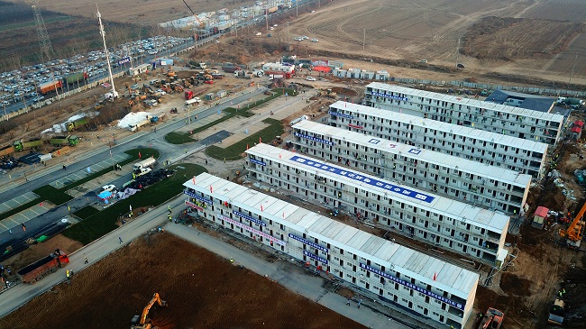 起步就是沖刺,開局就是決戰。1月31日晚8點,接到用10天時間建成西安市公共衛生中心辦公生活區的命令,陜建集團迅速成立了以張義光為總指揮的項目建設領導小組,連夜調派陜建機施集團、一建集團、產投集團、物流公司、混凝土公司五家單位進場。2月1日,2400余名施工人員和150多臺機械全部集結到位。2月2日,設計圖紙確定,項目大會戰正式打響。2月4日,僅用100個小時完成箱房首吊。2月6日,水塔鋼結構支架安裝完成,化糞池安裝到位,室外停車場草皮磚鋪設完成,全部箱房吊裝完畢。2月9日晚十點,經過9天9夜、216個小時的不間斷鏖戰,提前一天完成施工任務并交付使用。