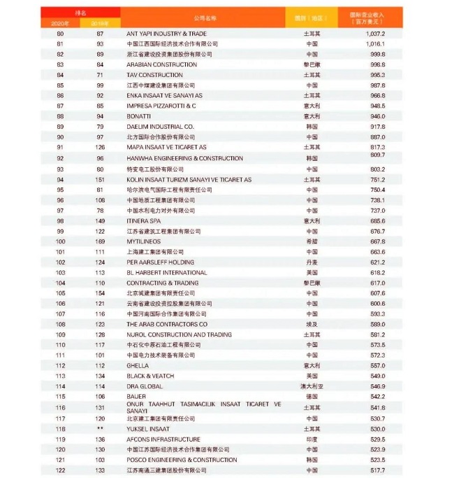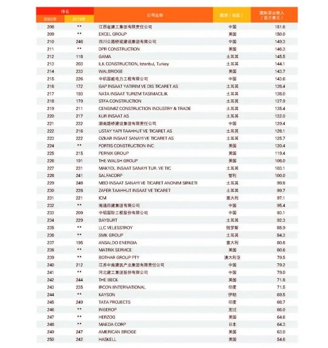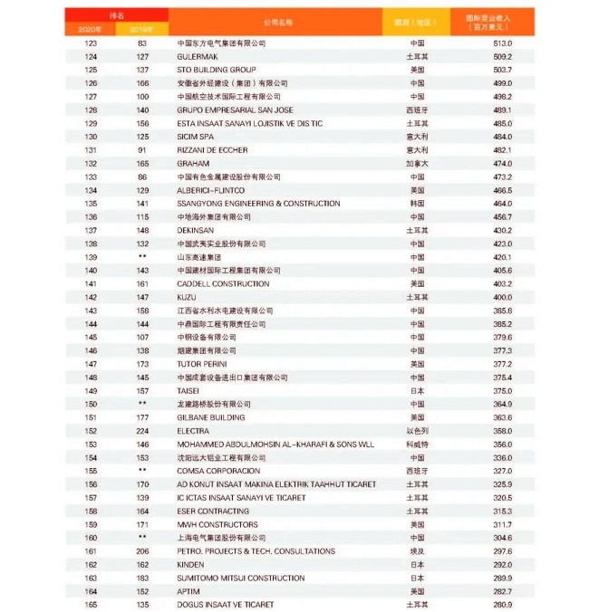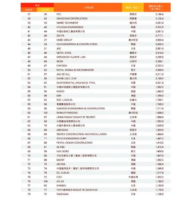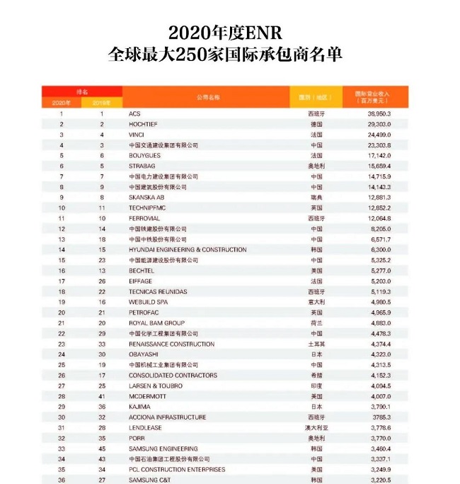 從中國企業來看,共有74家企業上榜,較上一年度減少1家,主要原因是部分企業實施了合并重組,由母公司統一參評。與2019年度相比,入圍今年“全球最大250家國際承包商”的74家中國企業中,有37家排名上升,其中上升幅度最大的為北京城建,排名從第154位上升至第105位,其次為安徽外經,排名從第166位上升至126位;27家企業排名下降;2家與2019年度排名持平;新上榜企業8家,分別是山東高速集團、龍建路橋股份有限公司、上海電氣集團股份有限公司、天元建設集團有限公司、湖南建工集團有限公司、江西省建工集團有限公司、南通四建集團有限公司、河北建設集團股份有限公司。在新上榜企業中,山東高速集團與龍建路橋表現較為亮眼,進入排名前150強,排名分別為第139位和第150位。