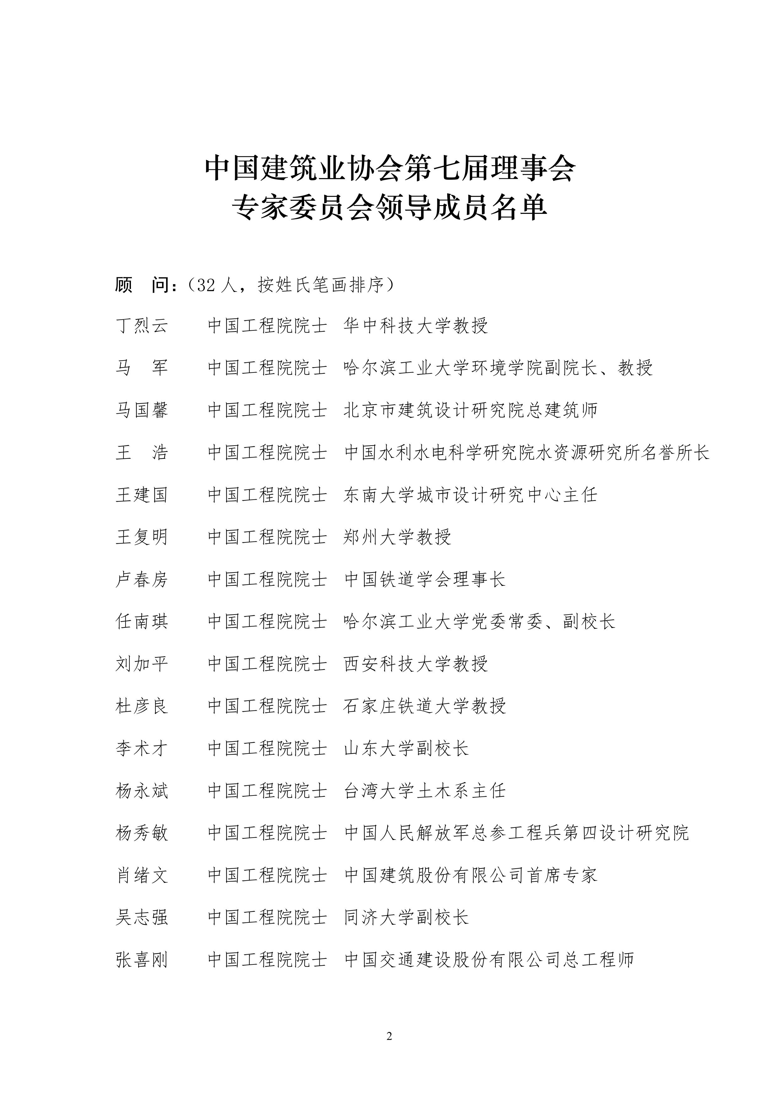 為貫徹落實科技強國、人才興國和創新驅動發展戰略,進一步提升中國建造水平,充分發揮工程建設行業專家作用,提高協會服務水平,按照《中國建筑業協會章程》有關規定,經我會會長辦公會研究,確定了第七屆理事會專家委員會領導成員名單,現予以公布。